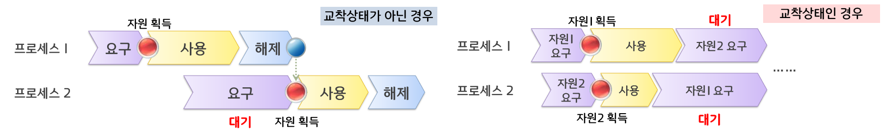 (2) 점유 대기 조건 - 프로세스가 이미 다른 자원을 할당받아 배타적으로 점유하고 있는 상황에서 다른 프로세스가 점유하고 있는 자원이 해제되기를 기다리는 상황