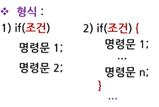 이때, 조건에 따라 수행해야 할 명령문이 복수개일 경우는 반드시 중괄호 { } 로 묶어야 한다.