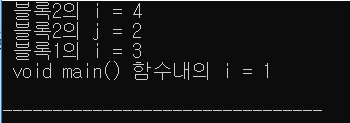 int i = 4; // 자동변수로서 블록 1에서만 사용가능