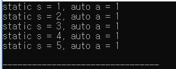 printf("static s = %d, auto a = %d \n", s, a) ; }