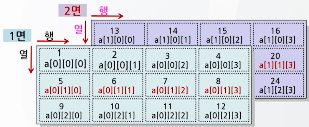| - 형식 : 자료형 배열명 [면의 수] [행의 수] [ 열의 수] - 사용 예 : int a [2][3][4] - 의미 : 3차원 배열로서, 배열명은 a이고 2면 3행 4열로된 24개의 요소를 가진 정수형 배열 |